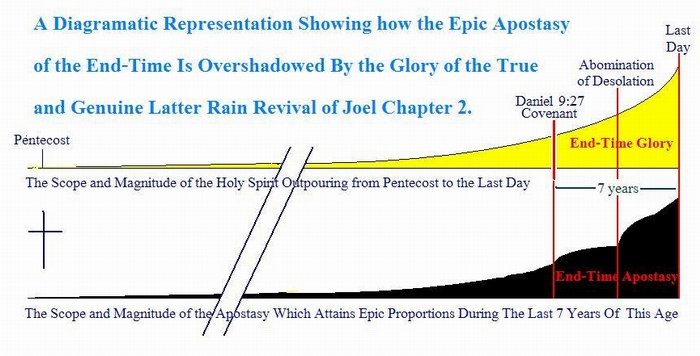 So our passage in Joel tells us quite a lot. We learn of the latter rain coming as a mighty revival with the Holy Spirit being poured out on all flesh. And we learn that this latter rain outpouring of the Holy Spirit will come to a peak very late in the sequence of end time events. Indeed the latter rain will climax in the very last days of this age and eclipse the end-time apostasy. In the diagram below we see that the end-time apostasy and the end-time revival are occurring simultaneously.