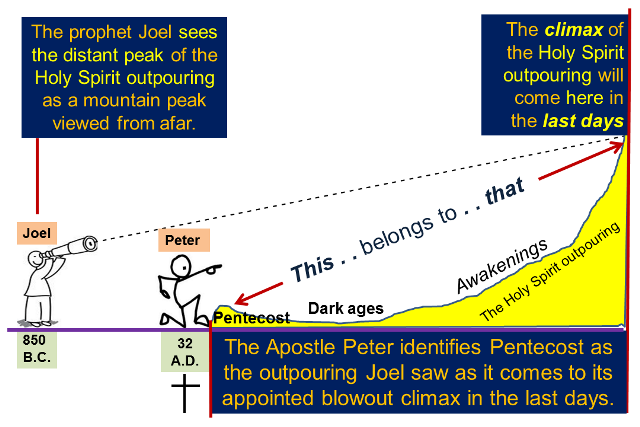 From his vantage point around 800 B.C. Joel saw the peak of the Holy Spirit outpouring. He saw it coming "afterwards" in the last days. Like the classic fireworks festival he witnessed the Holy Spirit revival riding up to a glorious crescendo and peaking toward the end of this present evil age. It was in the context of the final Battle of Armageddon and right in the end zone that Joel saw the Holy Spirit pouring out climactically in a blaze of glory upon all flesh. Not only that, Joel, like Zechariah (Zech 12:7-13:1), saw the salvation and deliverance of the Jewish house of Judah in Jerusalem. All this splendor was happening as a counterpoint to the cosmic signs of the 6th seal where the sun was turning to darkness and the moon to blood. -Joel 2:28-32 Even at that late hour the Word will go out, "Whosoever shall call upon the Name of the Lord shall be delivered/saved." From Jesus’ own words we know that these cosmic disturbances associated with the 6th seal precede and herald His second coming as Messiah. -Mat.24:29-31