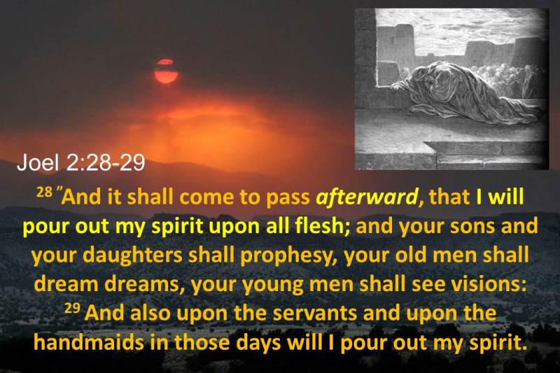 28. "And it shall come to pass afterward that I will pour out My Spirit on all flesh; Your sons and your daughters shall prophesy, your old men shall dream dreams, your young men shall see visions.