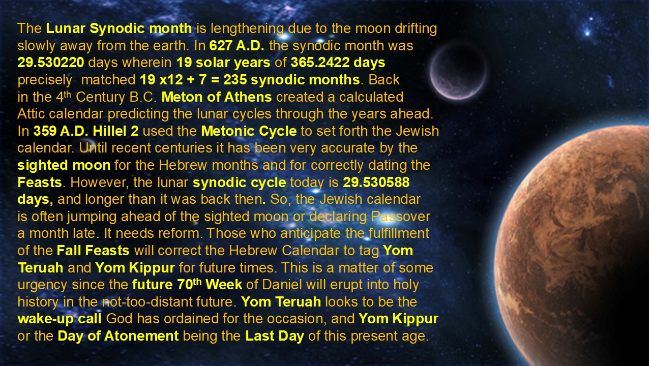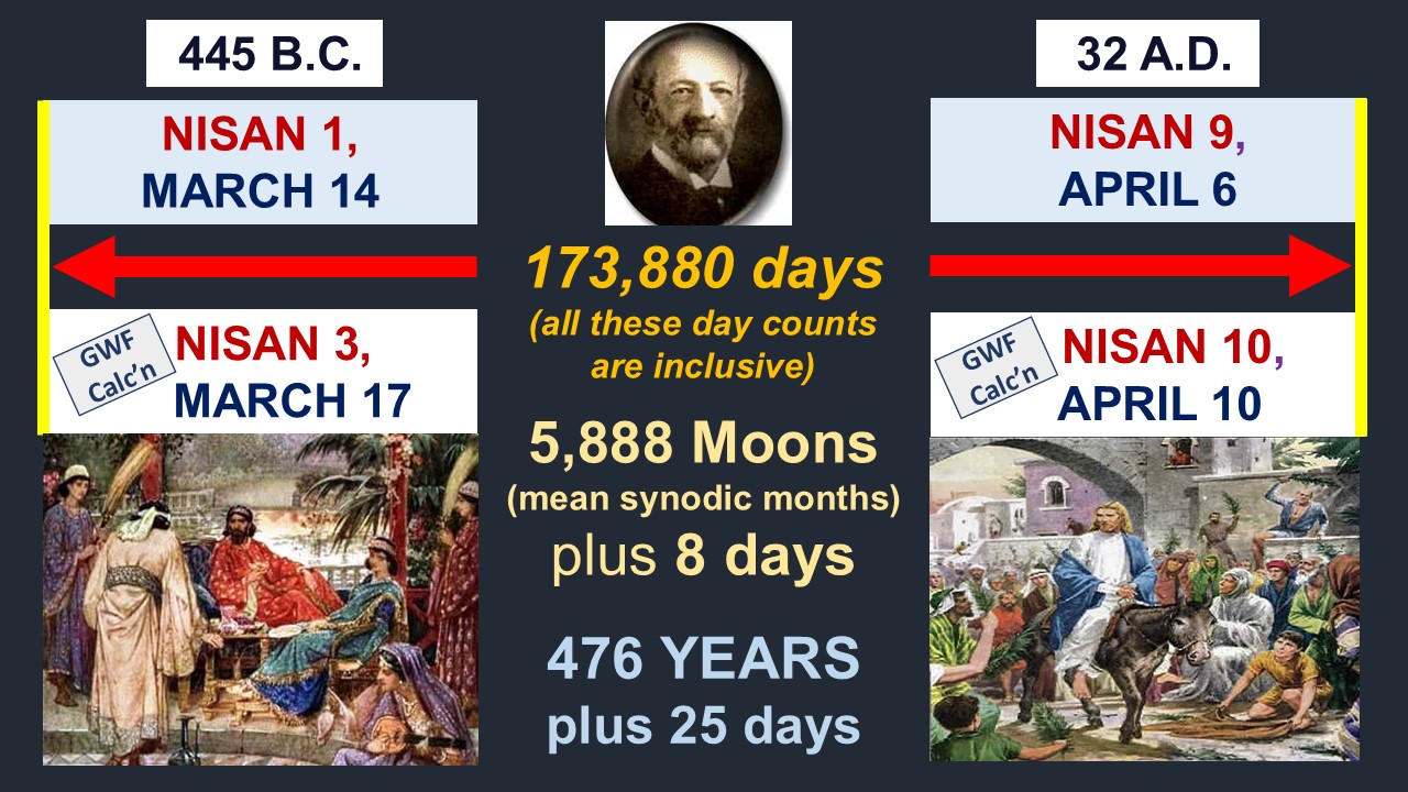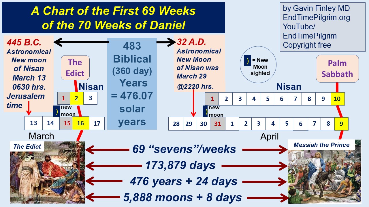From the Nisan moon of the Edict of Artaxerxes given to the cup-bearer Nehemiah, to the 10th day of the Nisan moon that shone over the First Coming of "Messiah the Prince" on Palm Sabbath in the Passion Year, ran a bridging day count of 69 x 7 x 360 = 173,880 days. These are the first 69 Weeks (or "69 Sevens"), of the Seventy Weeks Prophecy. The author, used the NASA moon-phase tables from the Astropixels.com website to reconstruct the Hebrew calendar for the years of the Edict and the year of the Passion of Messiah and thereby lay out the timeline backwards from Nisan 10 of 32 A.D. This confirmed the wonderful work of evangelical Scotland Yard Inspector Sir Robert Anderson as outlined in his book, "The Coming Prince". The reason this study is so important is that it provides absolute irrefutable proof that up ahead, in a time window yet to unfold, is the Full Future 70th Week of Daniel, there in the Final 7 Years of this age. For a full expansion of this subject go to the introductory web page for the Seventy Weeks Prophecy.