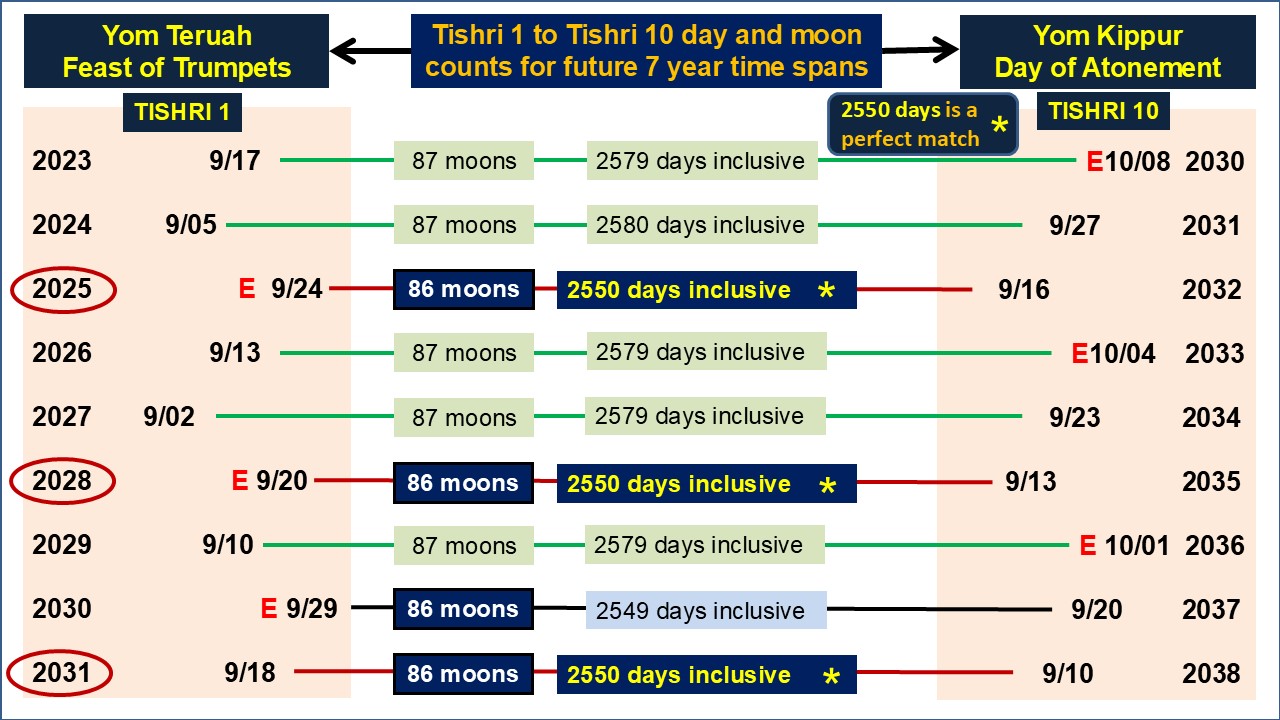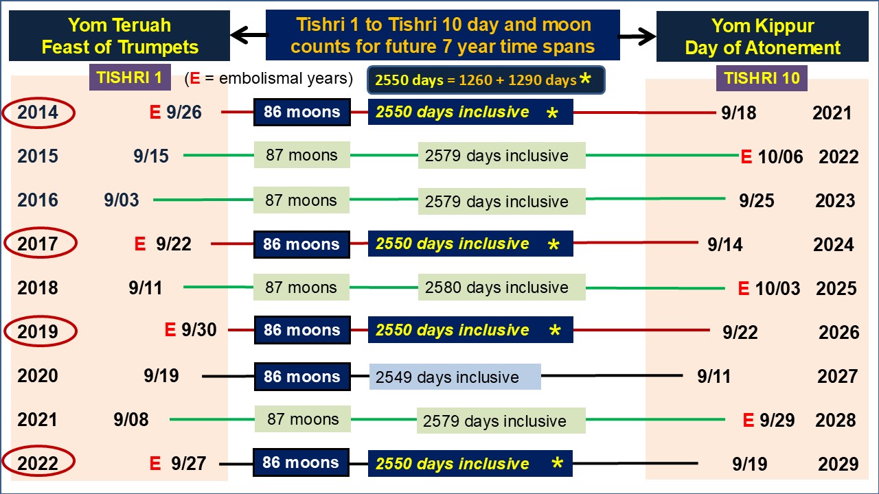 Some 20 years ago the author discovered that the Future 70th Week of Daniel and the final 7-years of this age, a day count of 1260 + 1290 = 2550 days in certain seven years spans across 86 moons, (and not 87 moons), matches up precisely with the bridging inclusive day count between the two yet to be fulfilled Fall Feasts of the LORD. The author believes that when the saints enter into those final 7 years this precise timeline will be a welcome and very helpful roadmap of sorts for them. It also gives them full assurance that the Holy One of Israel is sovereign in the affairs of men, and sets the limits over unfolding holy history here on earth below.