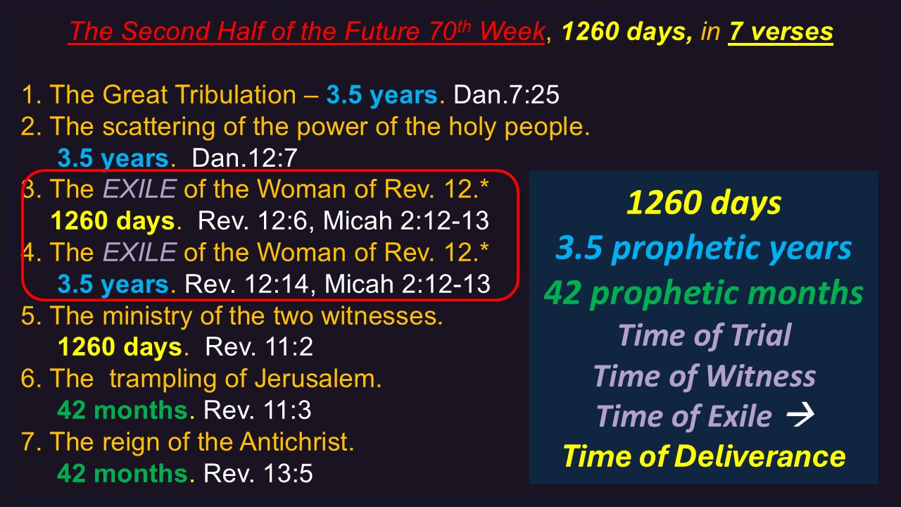 These seven verses-describe the1260 days, 42 prophetic months, or 3.5 prophetic years, all identical, that measure out the latter-half-of the future 70th Week of Daniel.